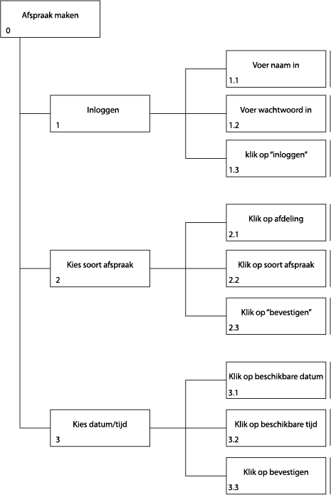 Gebaseerd hierop hebben we een Use Case Diagram gemaakt van hoe patiënt en arts gebruik maken van het systeem. Zo kregen we een goed beeld van wat voor taken de gebruiker uit moet voeren. Deze taken hebben we vervolgens ook in een Hiërarchisch Taakdiagram gezet om deze nog verder uit te diepen. Om vast te stellen hoe de website precies gestructureerd moet worden, hebben we een Flowchart gemaakt. Deze geeft duidelijk aan welke acties van de gebruiker leiden tot welke locatie binnen het systeem. Alle bevindingen en ontwerpen hebben wij uiteindelijk samengevat in wire-frames van de verschillende pagina’s.