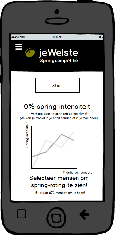 Hierna hebben we wat gebrainstormd. De experience rond een concert is grof in te delen in drie categorieën: De experience voor het concert, tijdens het concert en na het concert. We hadden twee ideeën voor twee verschillende momenten. Ons idee voor aanvang van het concert was een social media implementatie, waar men de verhalen, foto's en filmpjes van andere jeWelste-concertbezoekers kan bekijken. Zo kan een gebruiker zien wat voor soort band jeWelste is en hoe het er bij de concerten aan toe gaat. Ons idee voor tijdens een concert was een springcompetitie. Dit haakt in op jeWelste's slogan "100% springgarantie".