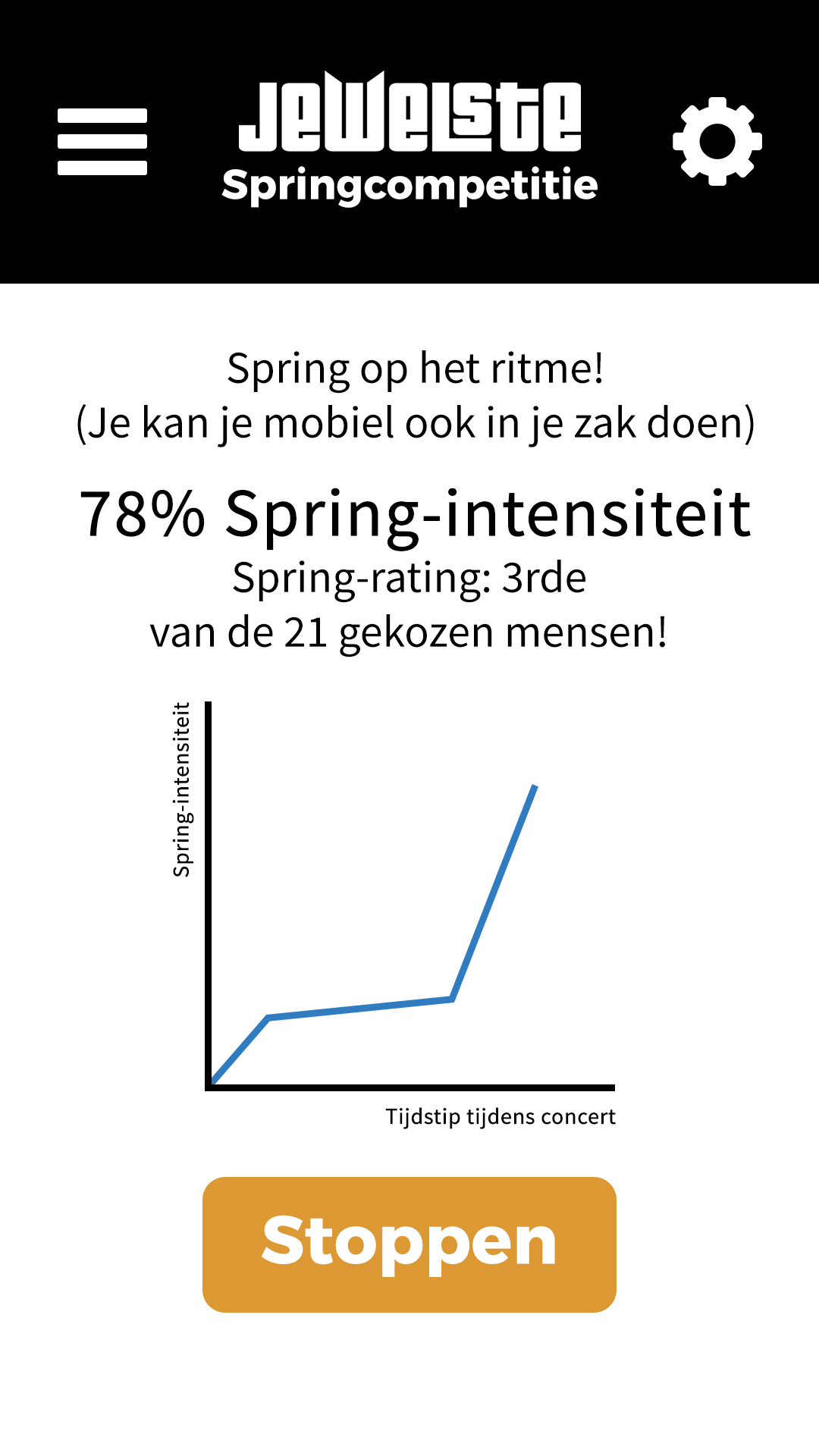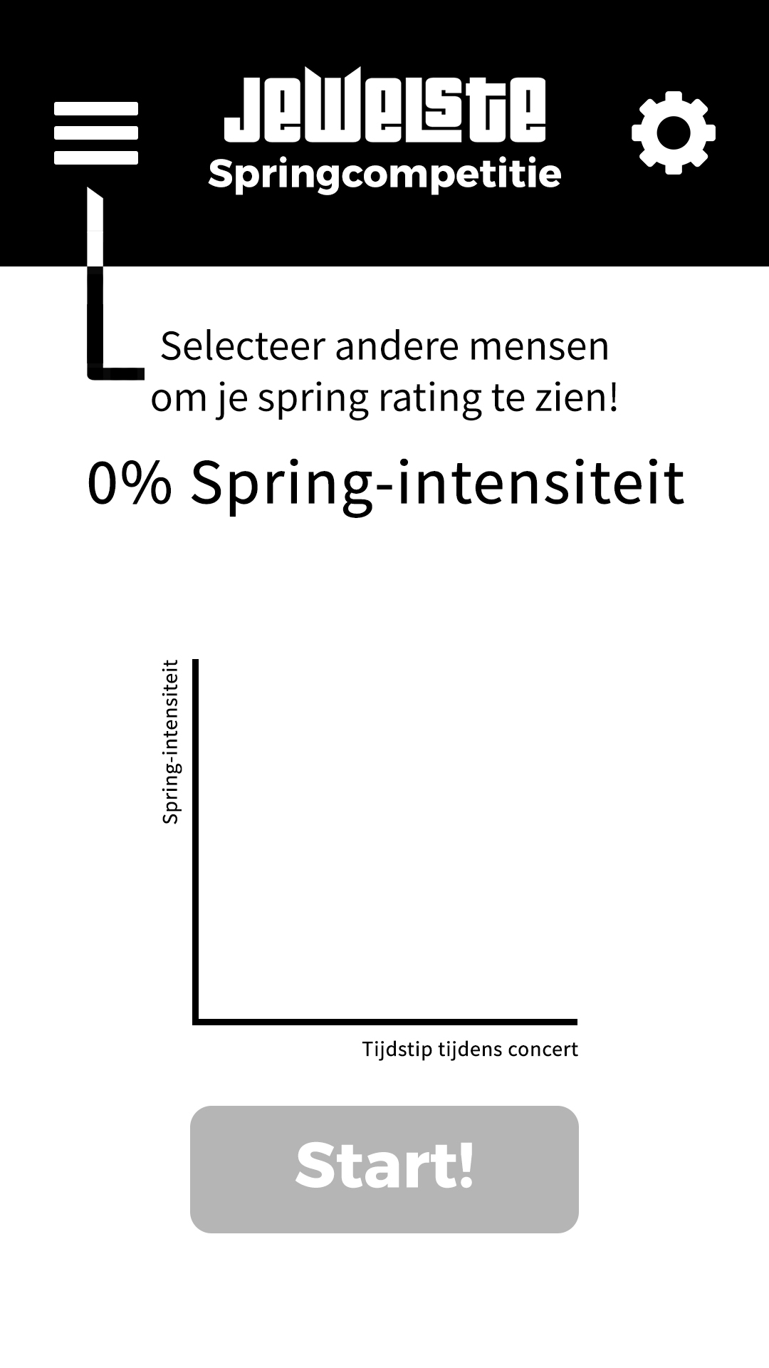 We misten nog een duidelijk link met ons onderzoek. Om het beter op de doelgroep te laten aansluiten, besloten we dat een springcompetitie tegen de mensen om je heen, dus ook je familie of vrienden, een logische optie was. Zo kun je vergelijken hoe goed je meespringt ten opzichte van de andere concertgangers. De uiteindelijke applicatie heeft uiteindelijk maar één functie, zodat deze de concertbezoekers verder niet afleidt.