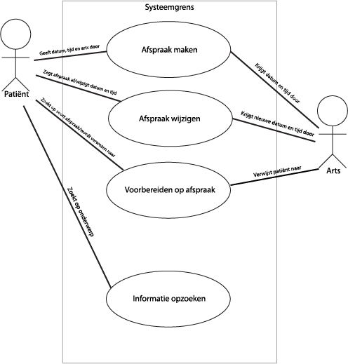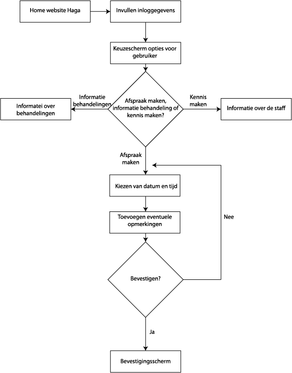 Gebaseerd hierop hebben we een Use Case Diagram gemaakt van hoe patiënt en arts gebruik maken van het systeem. Zo kregen we een goed beeld van wat voor taken de gebruiker uit moet voeren. Deze taken hebben we vervolgens ook in een Hiërarchisch Taakdiagram gezet om deze nog verder uit te diepen. Om vast te stellen hoe de website precies gestructureerd moet worden, hebben we een Flowchart gemaakt. Deze geeft duidelijk aan welke acties van de gebruiker leiden tot welke locatie binnen het systeem. Alle bevindingen en ontwerpen hebben wij uiteindelijk samengevat in wire-frames van de verschillende pagina’s.