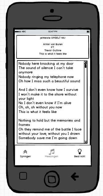 We werken het idee verder uit. We probeerden nog wat extra functies toe te voegen om de experience nog beter te maken: een knipperlicht en een meezingfunctie. Door tussentijds testen kwamen wij er alleen achter dat deze extra functies niet echt omarmd werden door de doelgroep. Als je een songtekst niet kent, sta je immers alleen maar naar je smartphone te kijken, iets wat we juist wilden voorkomen. Het knipperlicht werd als onnodig gezien. Iedereen heeft tegenwoordig immers al een zaklamp ingebouwd in zijn smartphone.