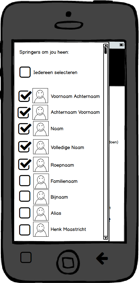 Hierna hebben we wat gebrainstormd. De experience rond een concert is grof in te delen in drie categorieën: De experience voor het concert, tijdens het concert en na het concert. We hadden twee ideeën voor twee verschillende momenten. Ons idee voor aanvang van het concert was een social media implementatie, waar men de verhalen, foto's en filmpjes van andere jeWelste-concertbezoekers kan bekijken. Zo kan een gebruiker zien wat voor soort band jeWelste is en hoe het er bij de concerten aan toe gaat. Ons idee voor tijdens een concert was een springcompetitie. Dit haakt in op jeWelste's slogan "100% springgarantie".