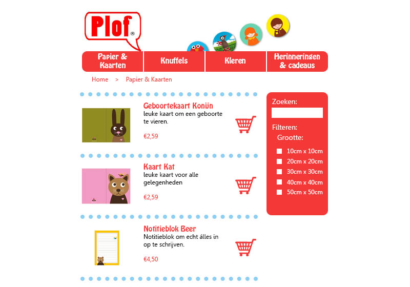 De opdracht aan ons als studenten was het ontwerpen van een website die meer op de moderne standaarden aansluit en de gebruiker zou helpen met het vinden van de producten die hij zoekt. De standaarden zijn gevat in bepaalde “patterns”, veelgebruikte elementen waarvan bewezen is dat deze bijdragen aan de usability van het ontwerp. In de verschillende mockups is te zien hoe de pagina’s eruit zouden komen te zien. Het was hierbij belangrijk dat de unieke grafische stijl van Plof.nl behouden zou blijven. Deze grafische stijl kenmerkte zich vooral door het gebruik van de kleur rood, wat ik heb overgenomen als de hoofdkleur voor het ontwerp.